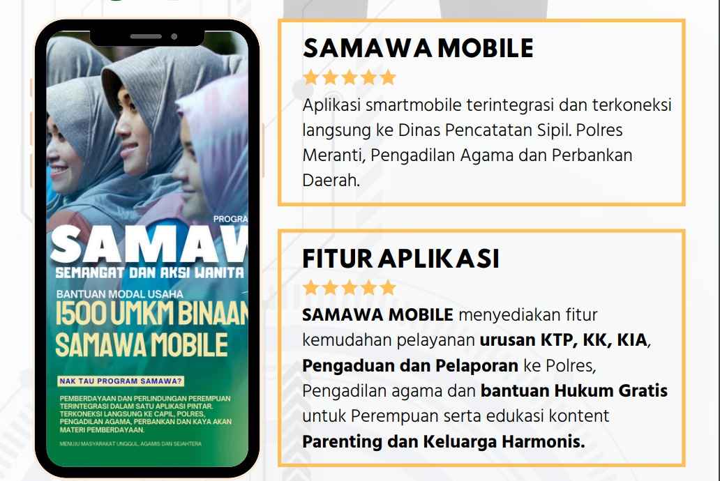 Tidak hanya fokus pada aspek administrasi dan hukum, SAMAWA Mobile juga memiliki fitur yang bertujuan untuk meningkatkan Pemberdayaan Ekonomi perempuan di Kepulauan Meranti. Aplikasi ini menyediakan informasi dan pelatihan terkait wirausaha serta peluang usaha lokal yang dapat diakses secara online.
