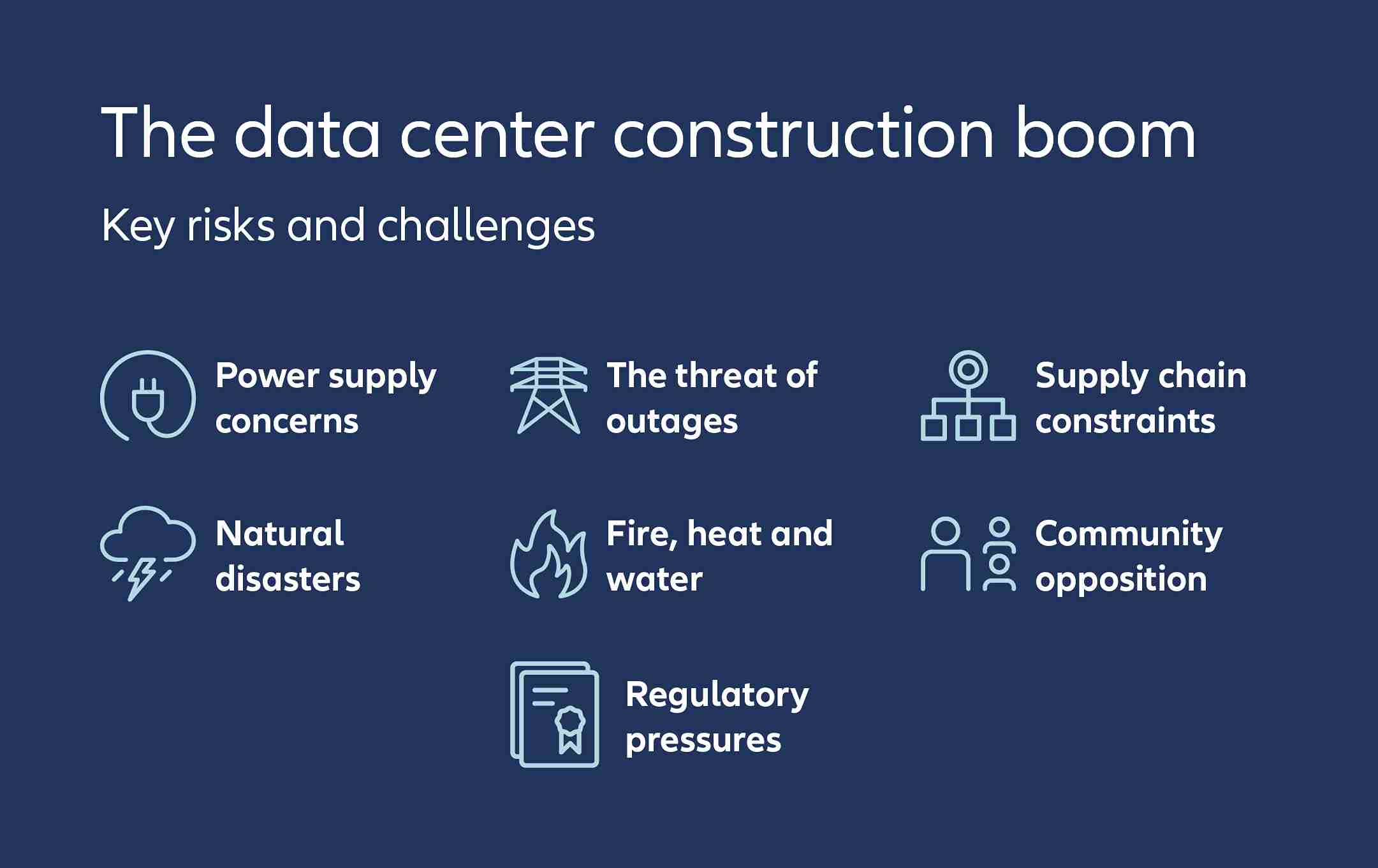 Konstruksi dan operasi pusat data menghadirkan risiko tinggi, termasuk kebutuhan listrik yang meningkat drastis, potensi kebakaran akibat baterai lithium-ion, dan penggunaan air hingga 19 juta liter per hari. Kondisi ini mendorong permintaan asuransi khusus dan sistem manajemen risiko canggih.