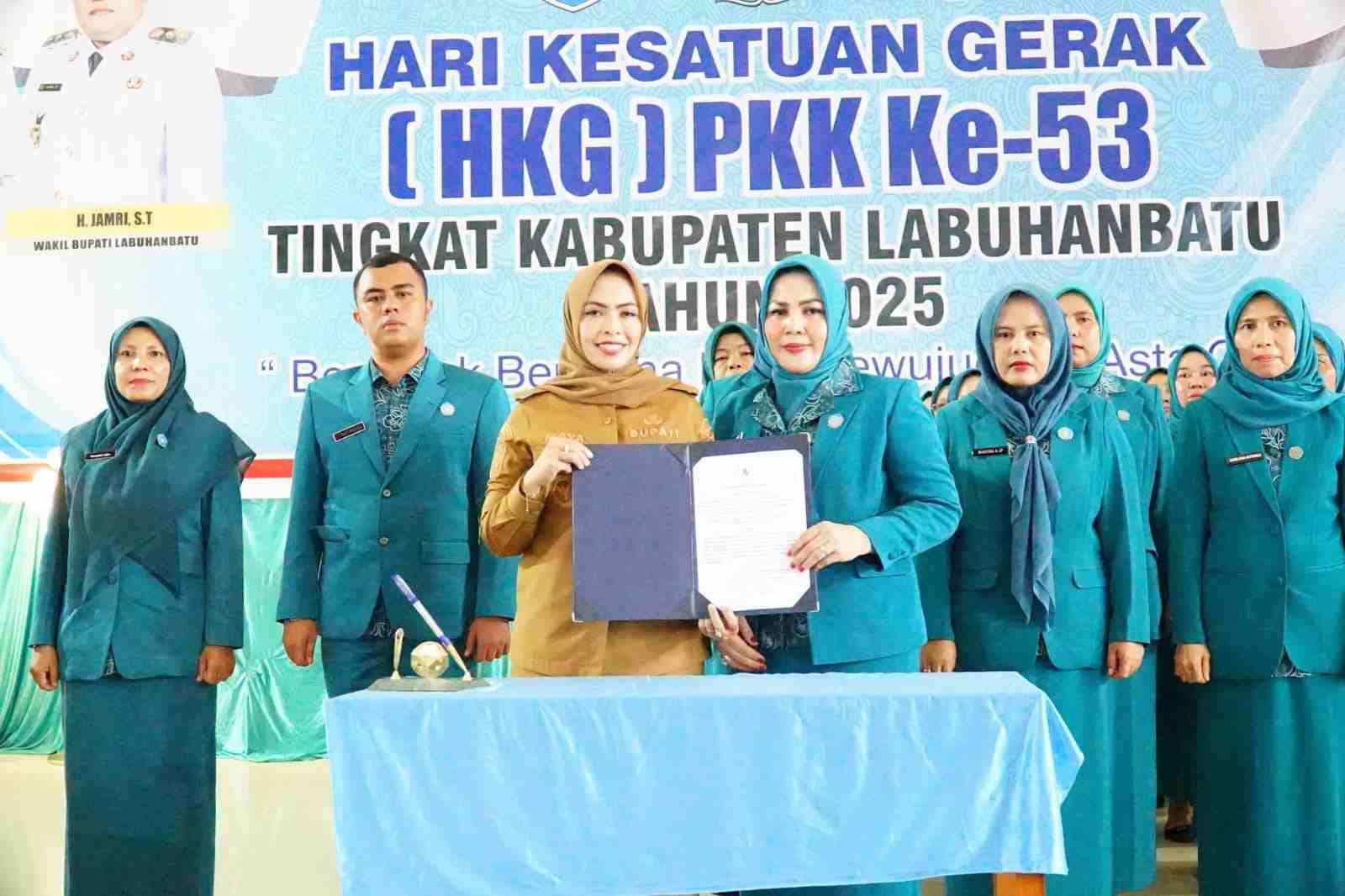 LABUHANBATU, SINKAP.info – Pemerintah Kabupaten Labuhanbatu bersama Tim Penggerak PKK Kabupaten memperingati Hari Kesatuan Gerak (HKG) PKK ke-53 di Aula Asrama Haji Ujung Bandar, Senin (8/12/2025). Kegiatan berlangsung khidmat dan dipenuhi suasana kebersamaan, sekaligus menjadi momentum penguatan komitmen PKK sebagai mitra strategis pemerintah dalam pemberdayaan keluarga dan peningkatan kualitas hidup masyarakat.