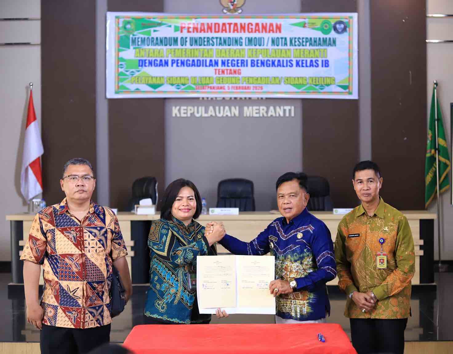 SELATPANJANG, SINKAP.info – Pemerintah Kabupaten Kepulauan Meranti menandatangani Nota Kesepahaman (Memorandum of Understanding/MoU) dengan Pengadilan Negeri (PN) Kelas II B Bengkalis terkait pelayanan sidang di luar gedung pengadilan atau sidang keliling. Kerja sama ini bertujuan mempermudah akses keadilan bagi masyarakat Meranti agar tidak perlu lagi bersidang ke Bengkalis.