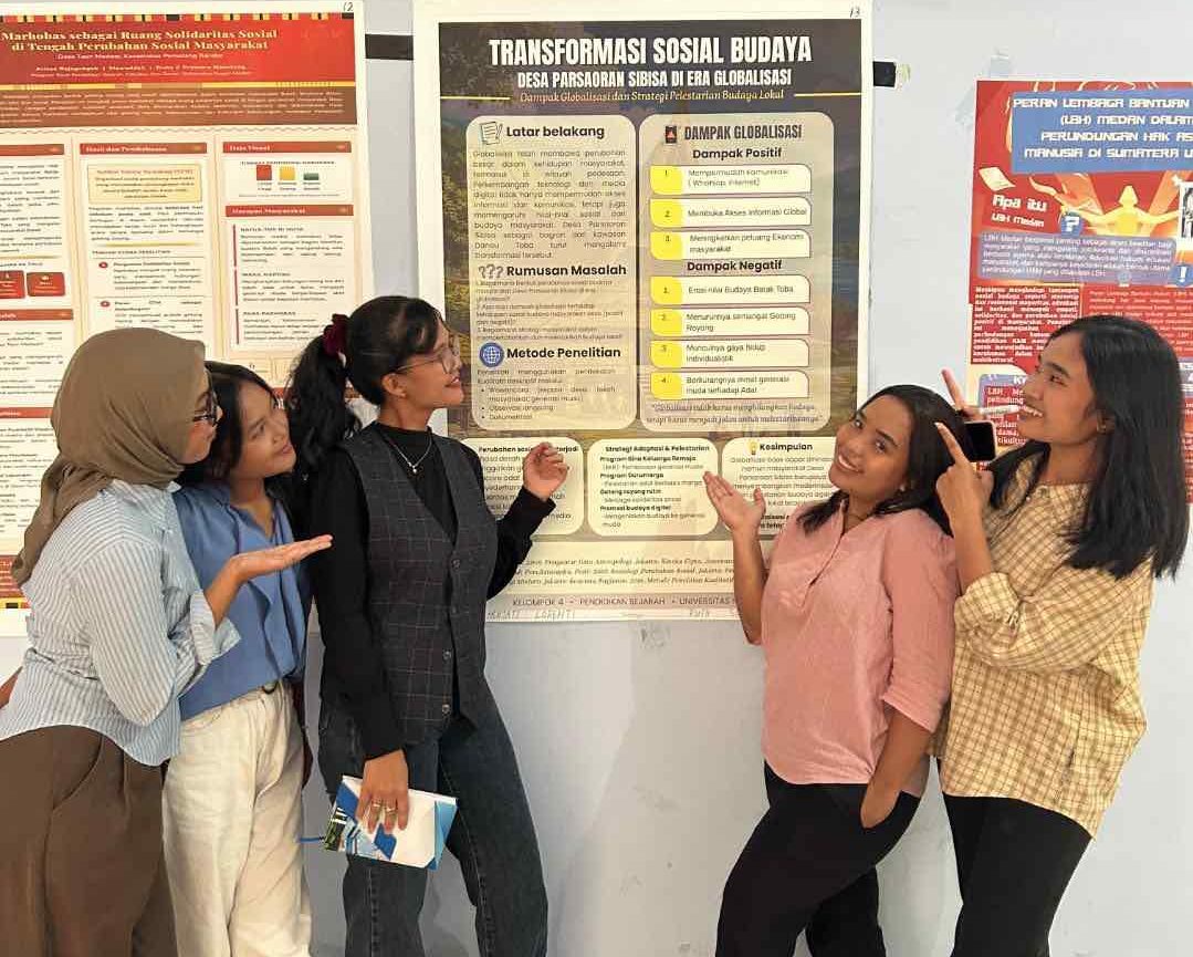 MEDAN, SINKAP.info — Mahasiswa Jurusan Pendidikan Sejarah, Fakultas Ilmu Sosial Universitas Negeri Medan menggelar pameran poster ilmiah yang mengangkat berbagai isu sosial dan budaya di Sumatera Utara, Selasa (22/4/2026). Kegiatan ini menjadi bagian dari pembelajaran mata kuliah Studi Masyarakat Indonesia.